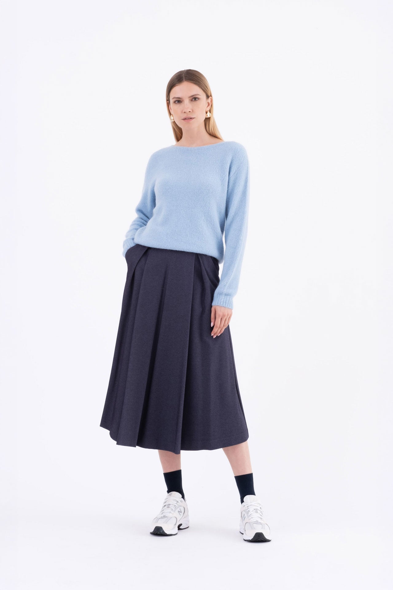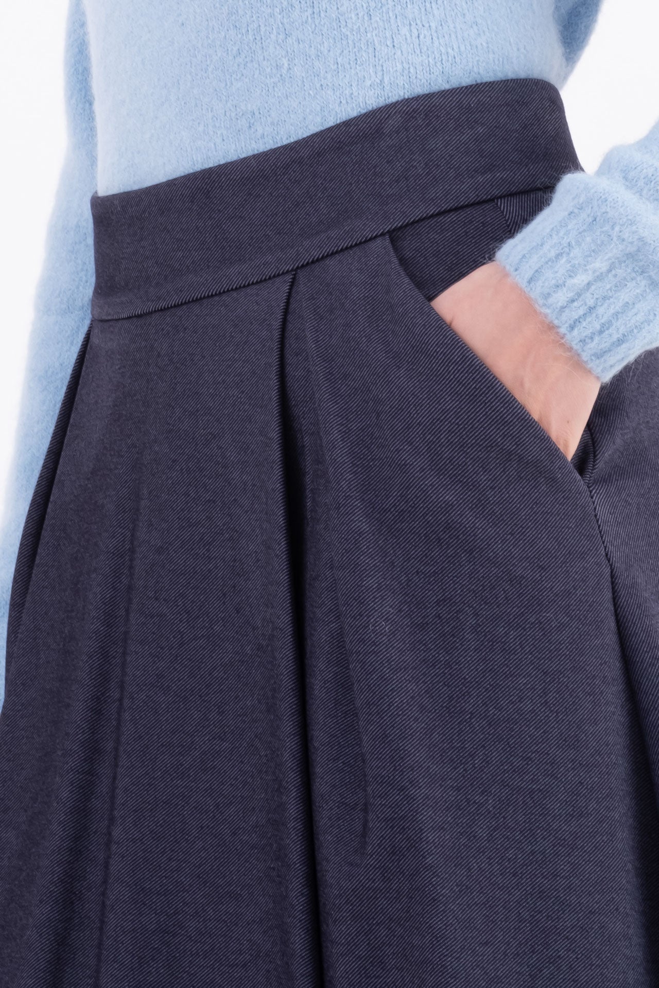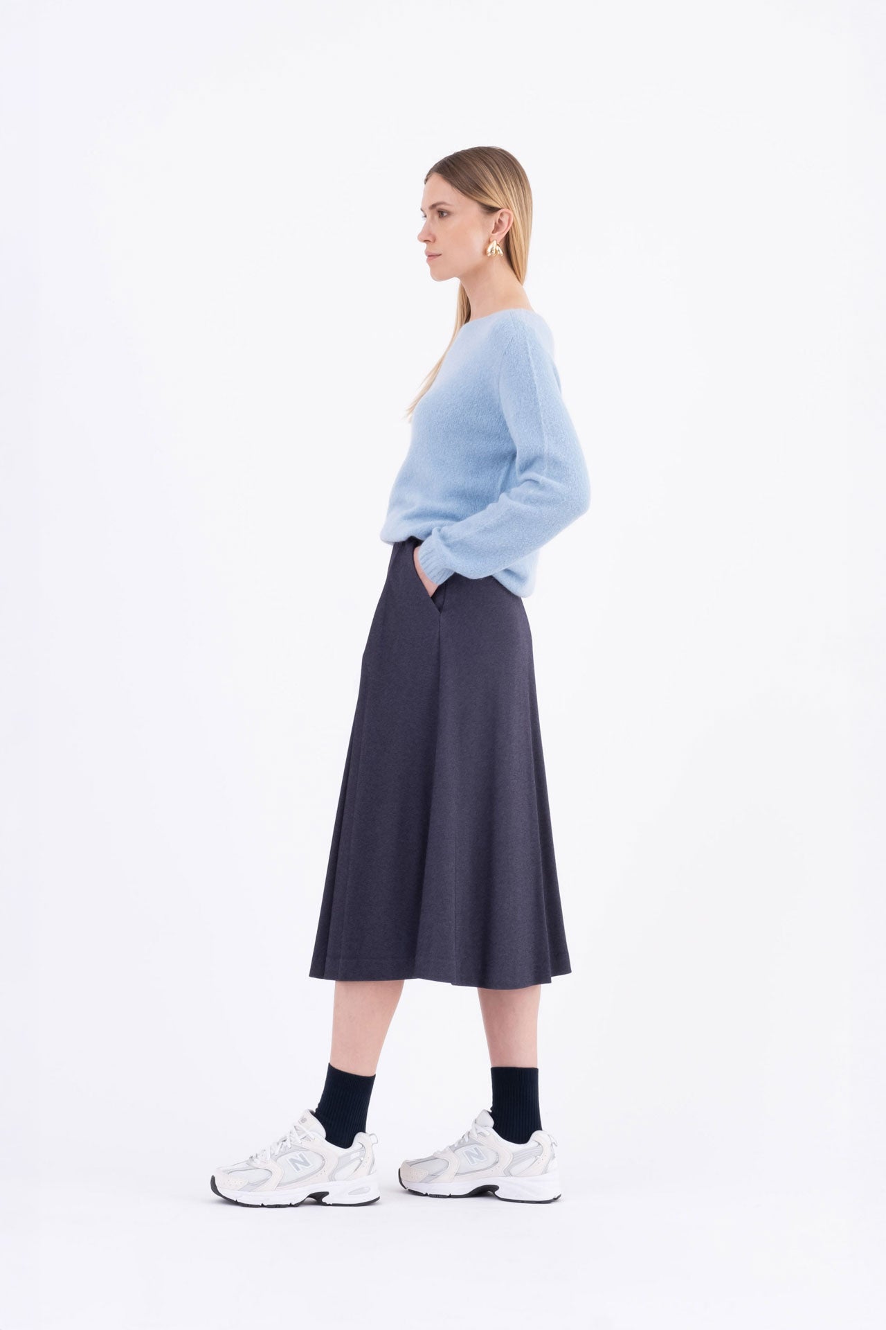 La linea svasata è valorizzata da tasche inserite nei fianchi e da una zip laterale invisibile.