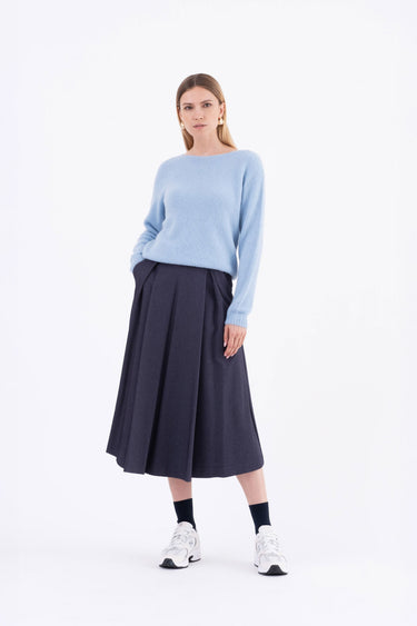 Gonna midi a tulipano in tessuto punto Milano diagonale, morbido ed elasticizzato, con una mano compatta e confortevole.