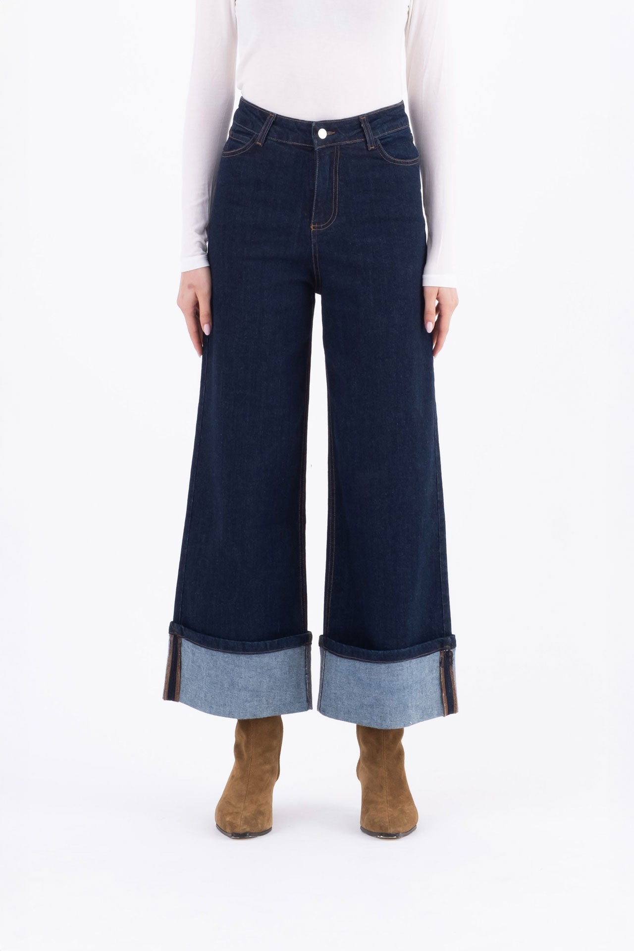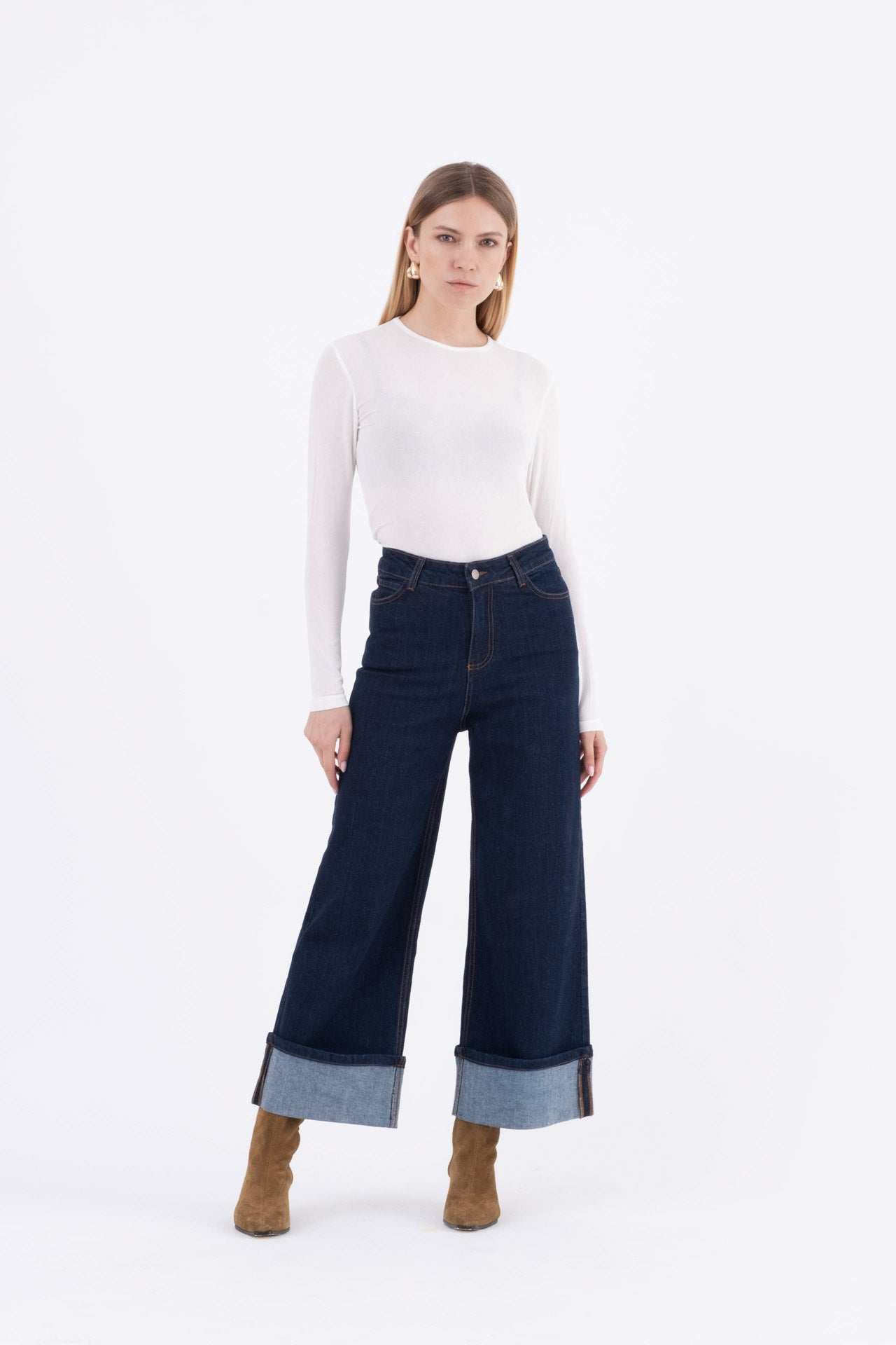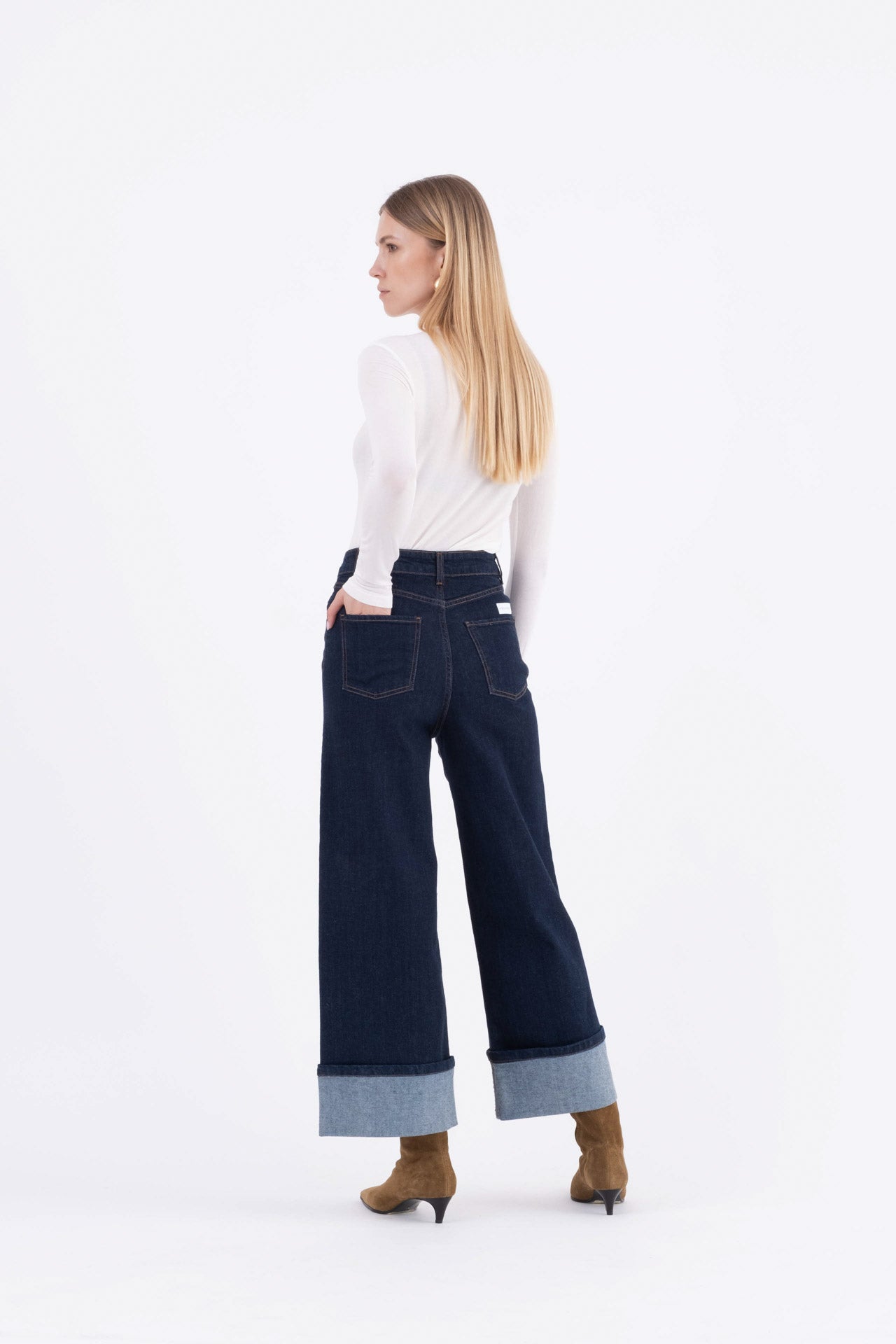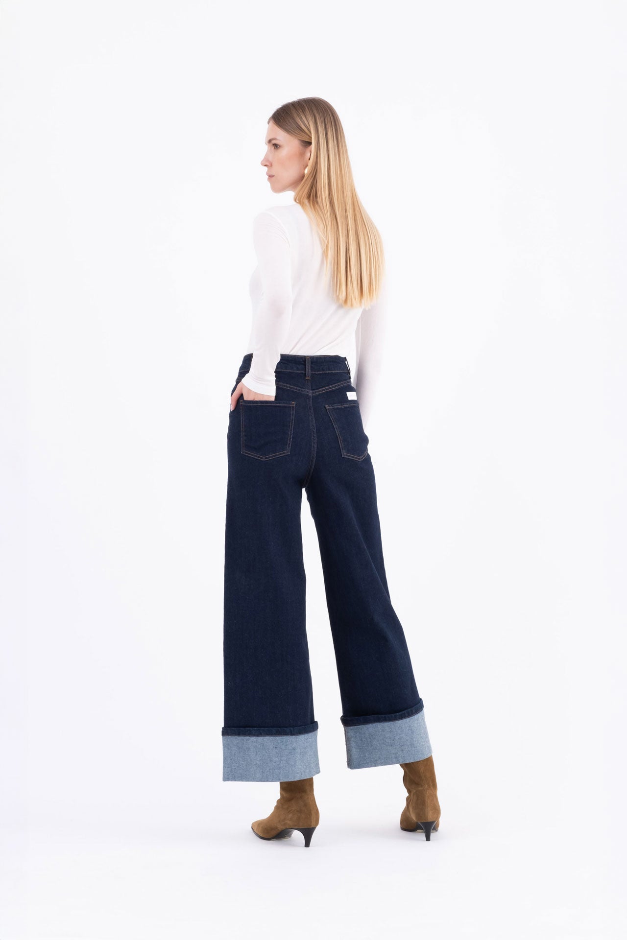 Jeans dalla linea pulita e moderna: gamba dritta, fondo ampio con risvolto alto e costruzione in denim di cotone stretch che garantisce comfort e libertà di movimento.