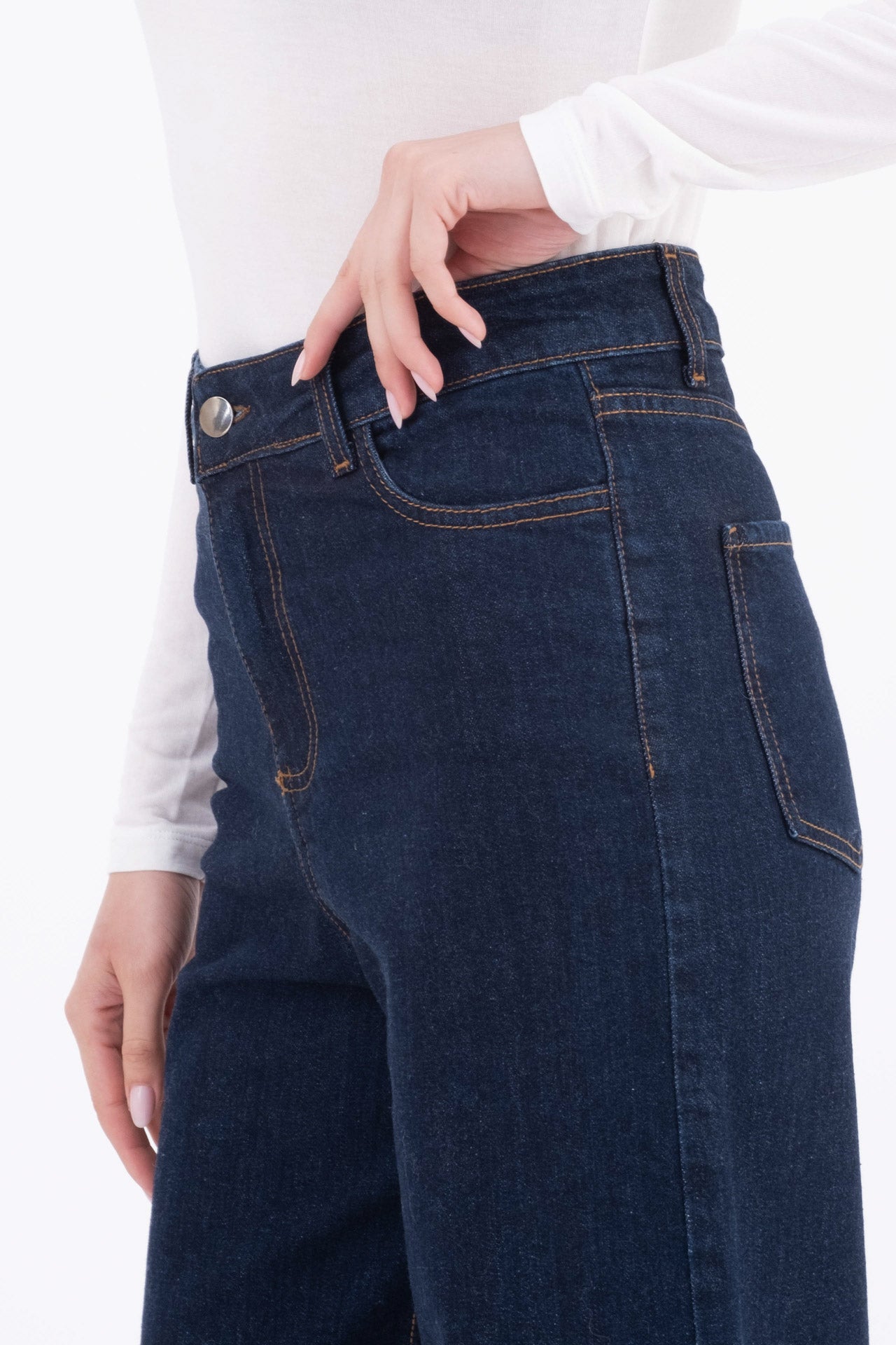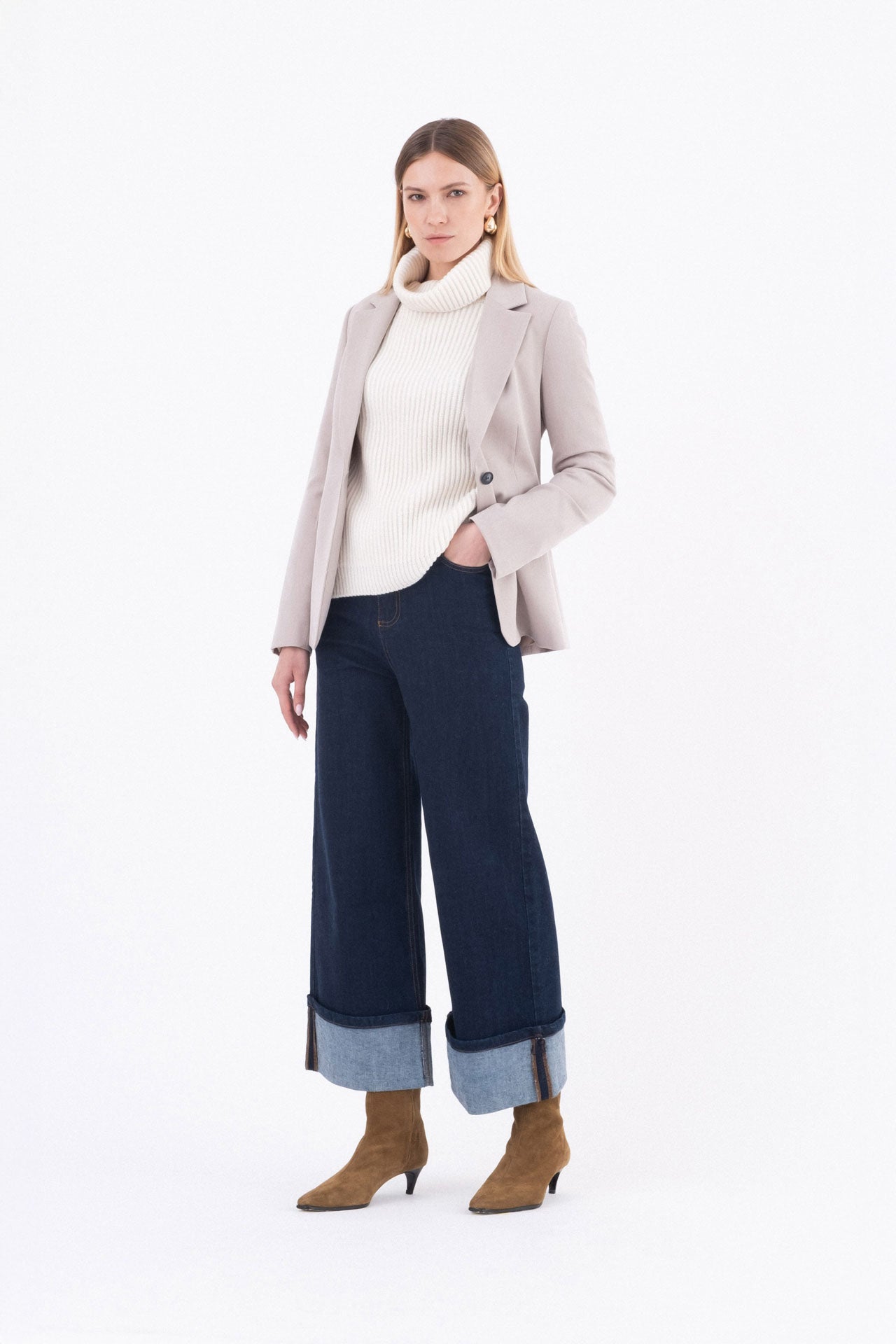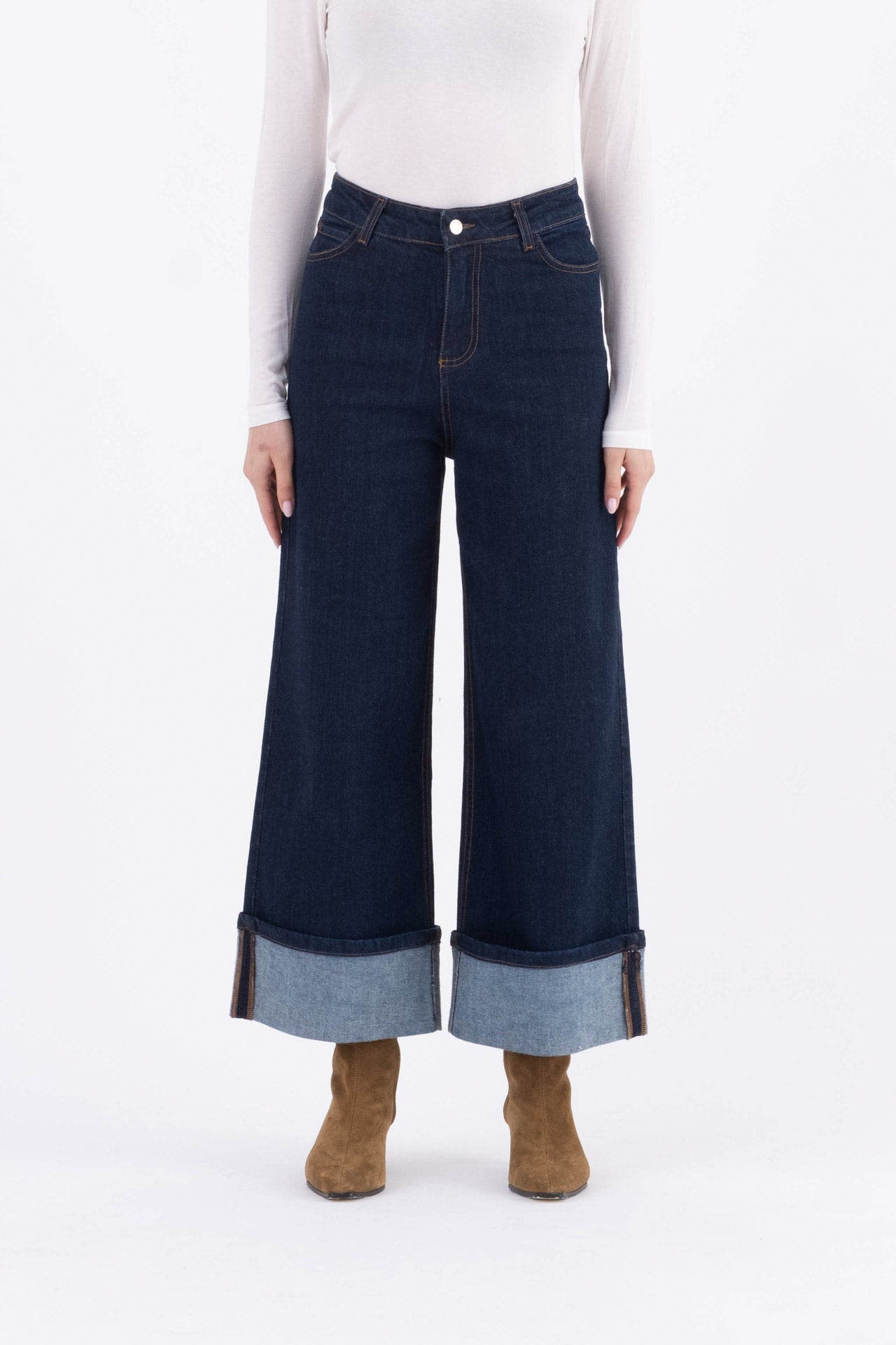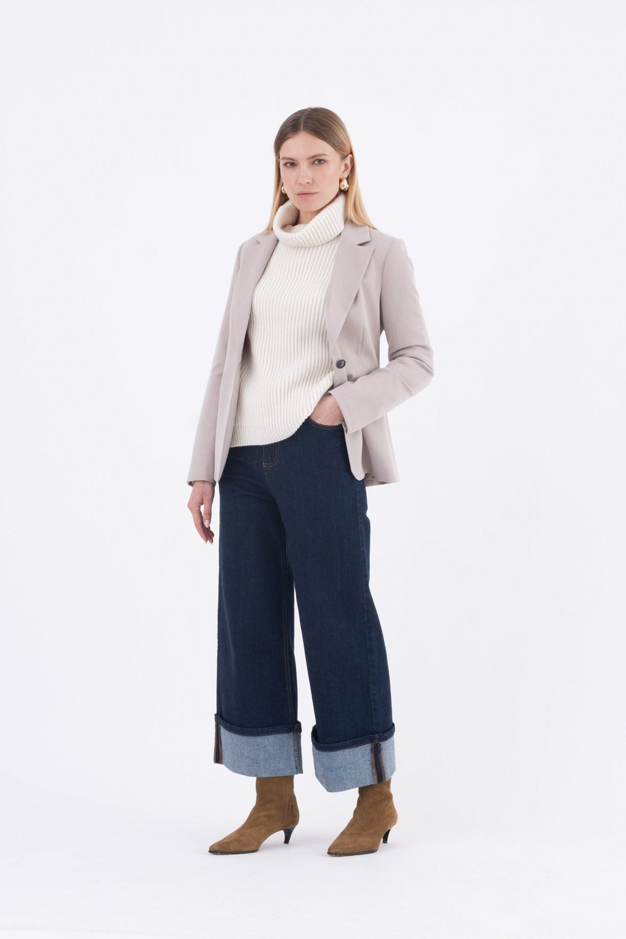 Jeans dalla linea pulita e moderna: gamba dritta, fondo ampio con risvolto alto e costruzione in denim di cotone stretch che garantisce comfort e libertà di movimento.