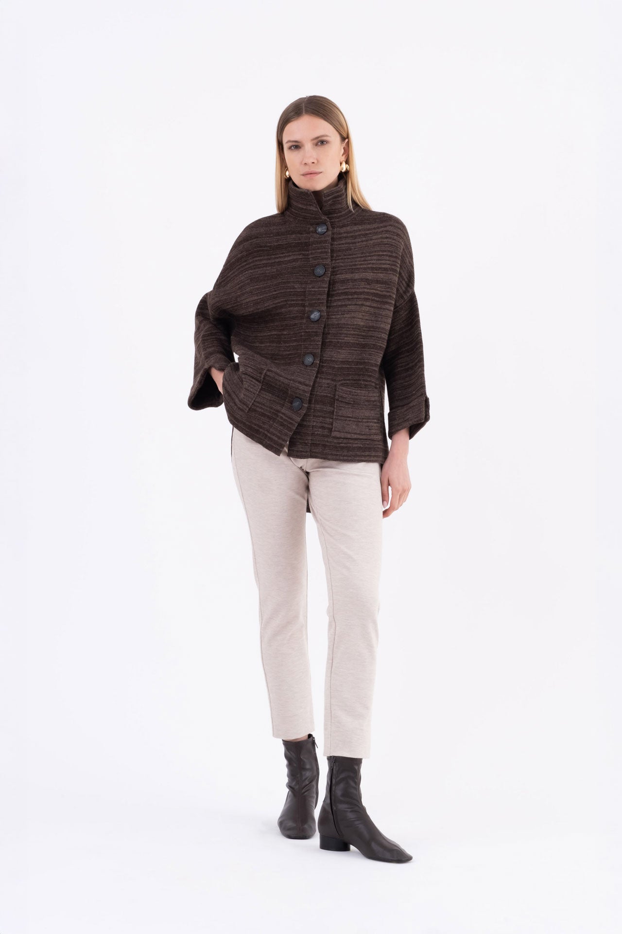 Il volume over e le tasche applicate sul davanti rendono questo capo estremamente versatile: può essere indossato come maglione morbido o come giacchino sopra a camicie, abiti o look a strati.