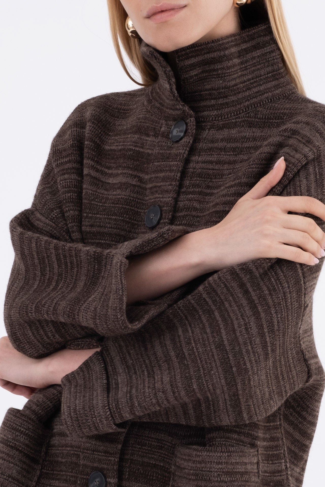 Maglia poncho in lana misto alpaca con abbottonatura a vista, spalla scesa e manica lunga con spacchetti al polso.