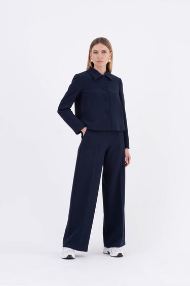 Il taglio palazzo è valorizzato dalla piega stirata sul davanti, che slancia la silhouette e aggiunge un tocco formale. Un capo essenziale, perfetto per look sofisticati da mattina a sera.
