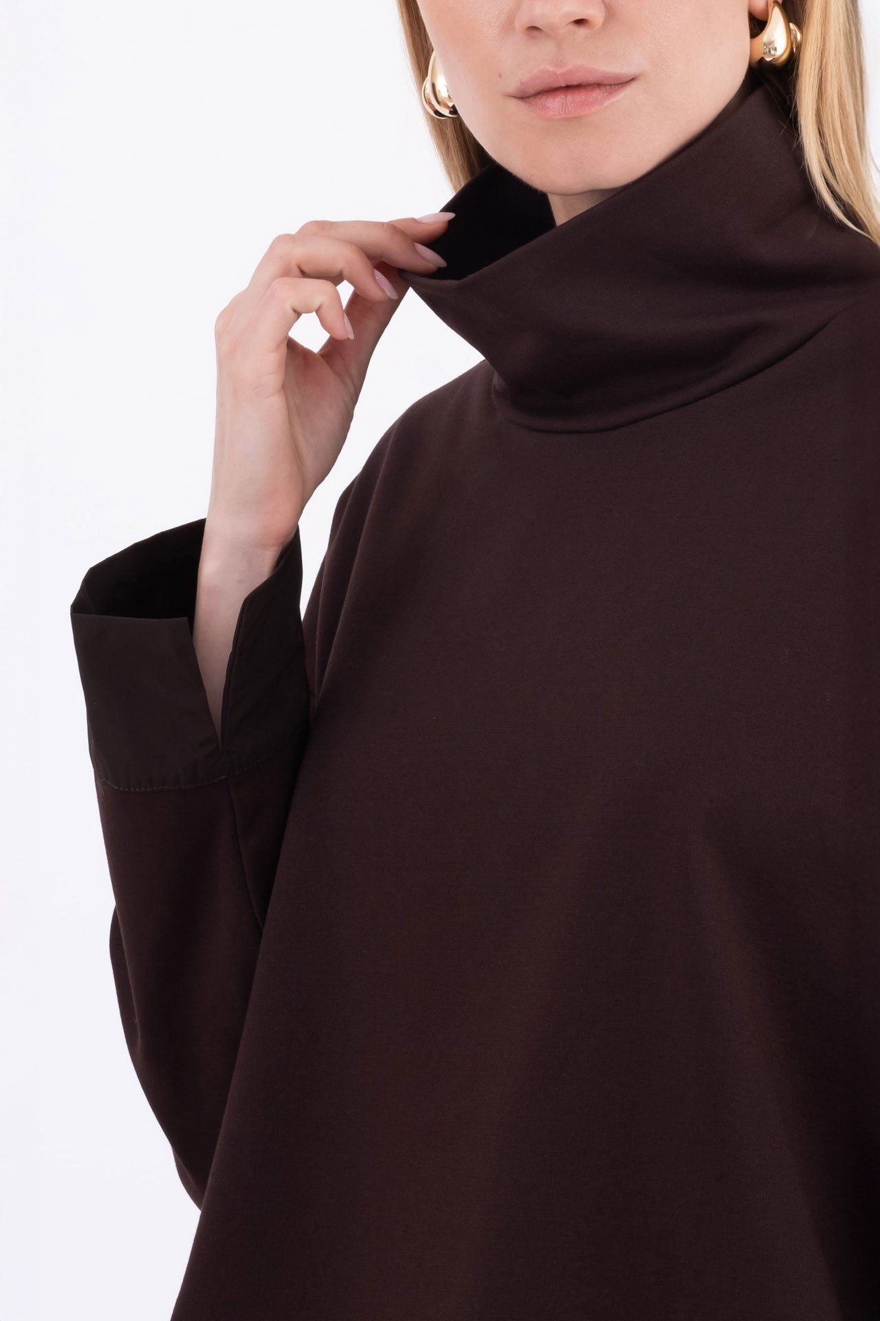Realizzata in punto Milano con inserti in taffetà, ha un fit boxy con collo alto morbido e spalla scesa che dona struttura e originalità al capo.