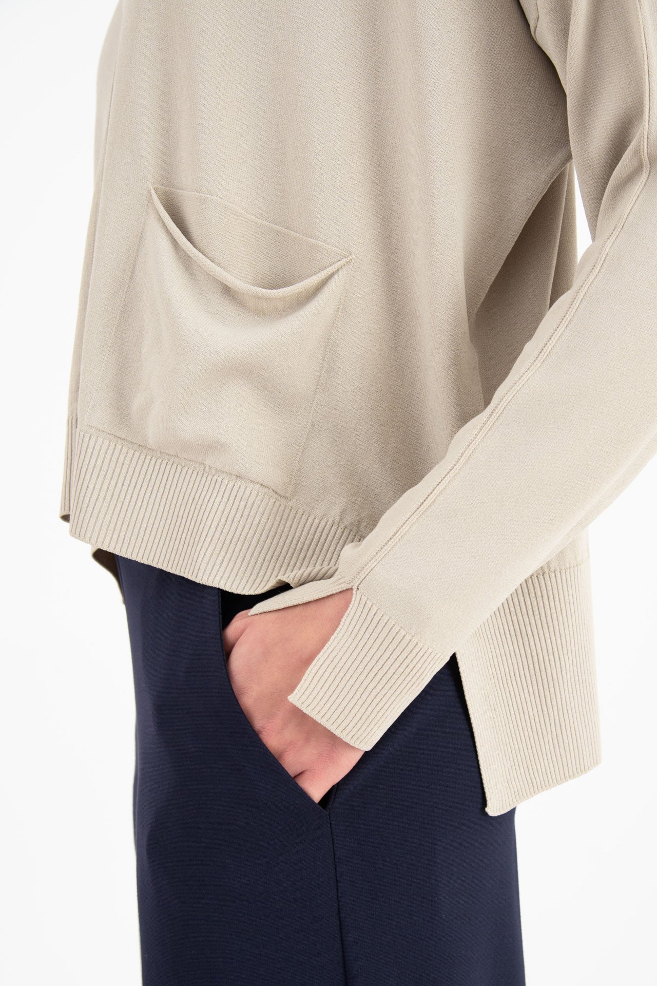 Le maniche lunghe, con polsino, completano il design, mentre le finiture in costa aggiungono un tocco di eleganza.