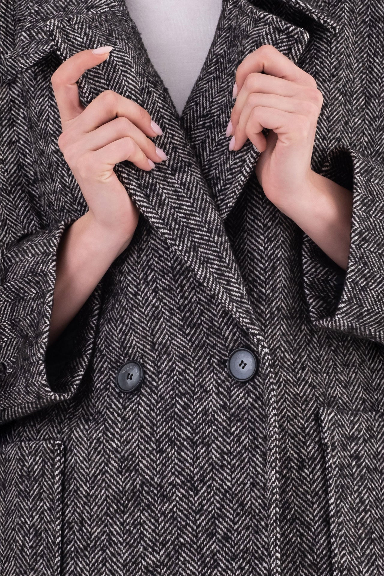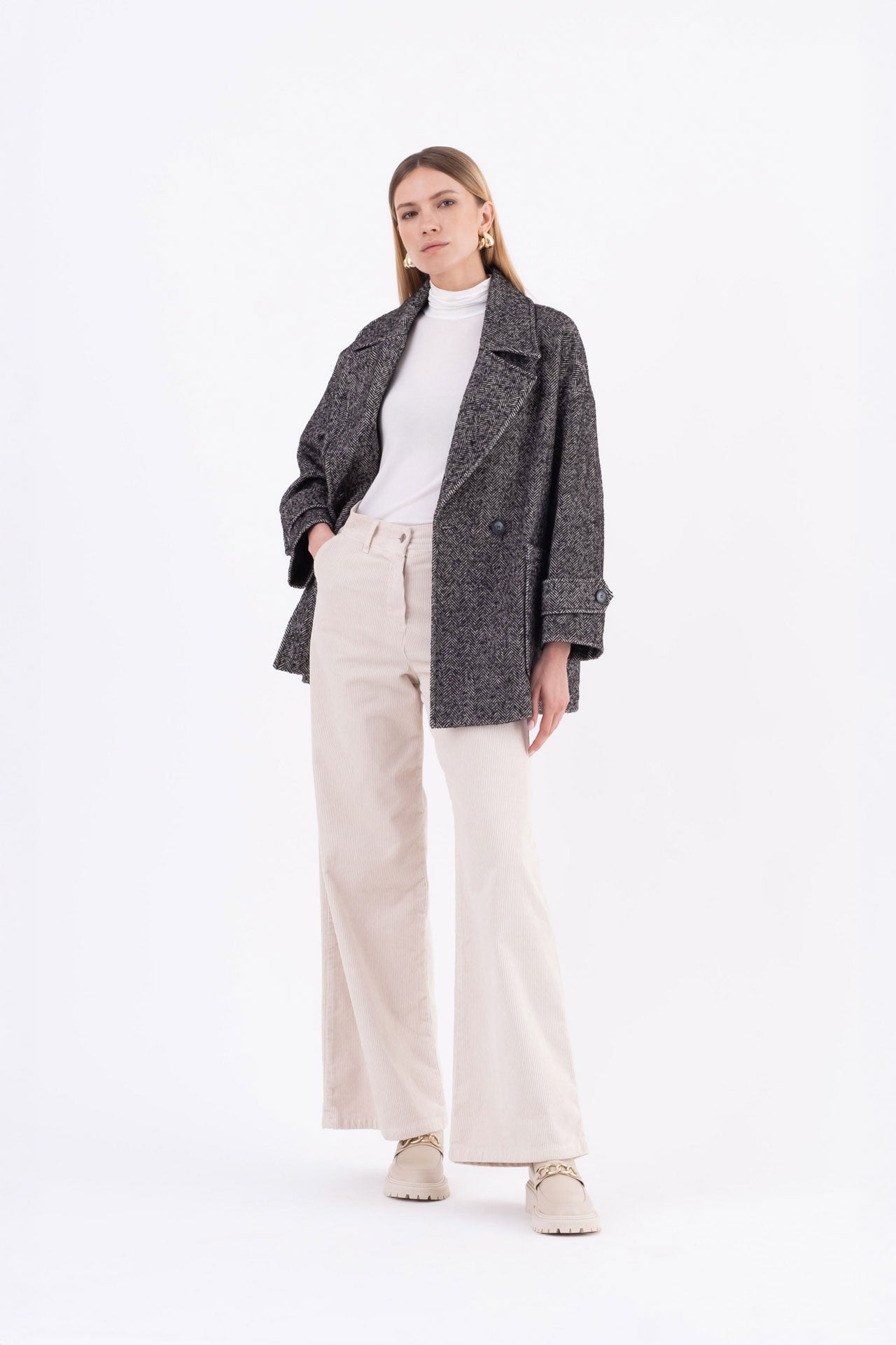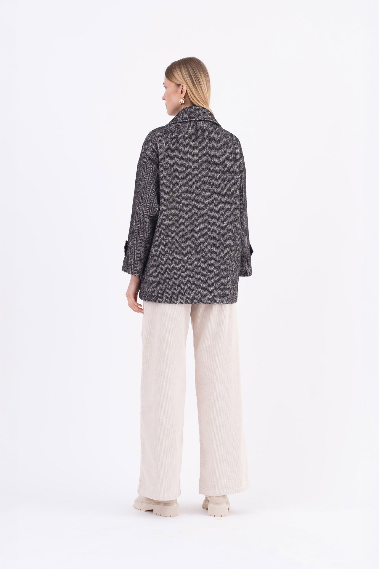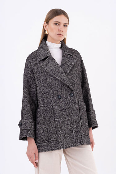 Oversized double-breasted caban in classic herringbone fabric, featuring dropped shoulders, applied front pockets, and buttoned sleeve tabs.