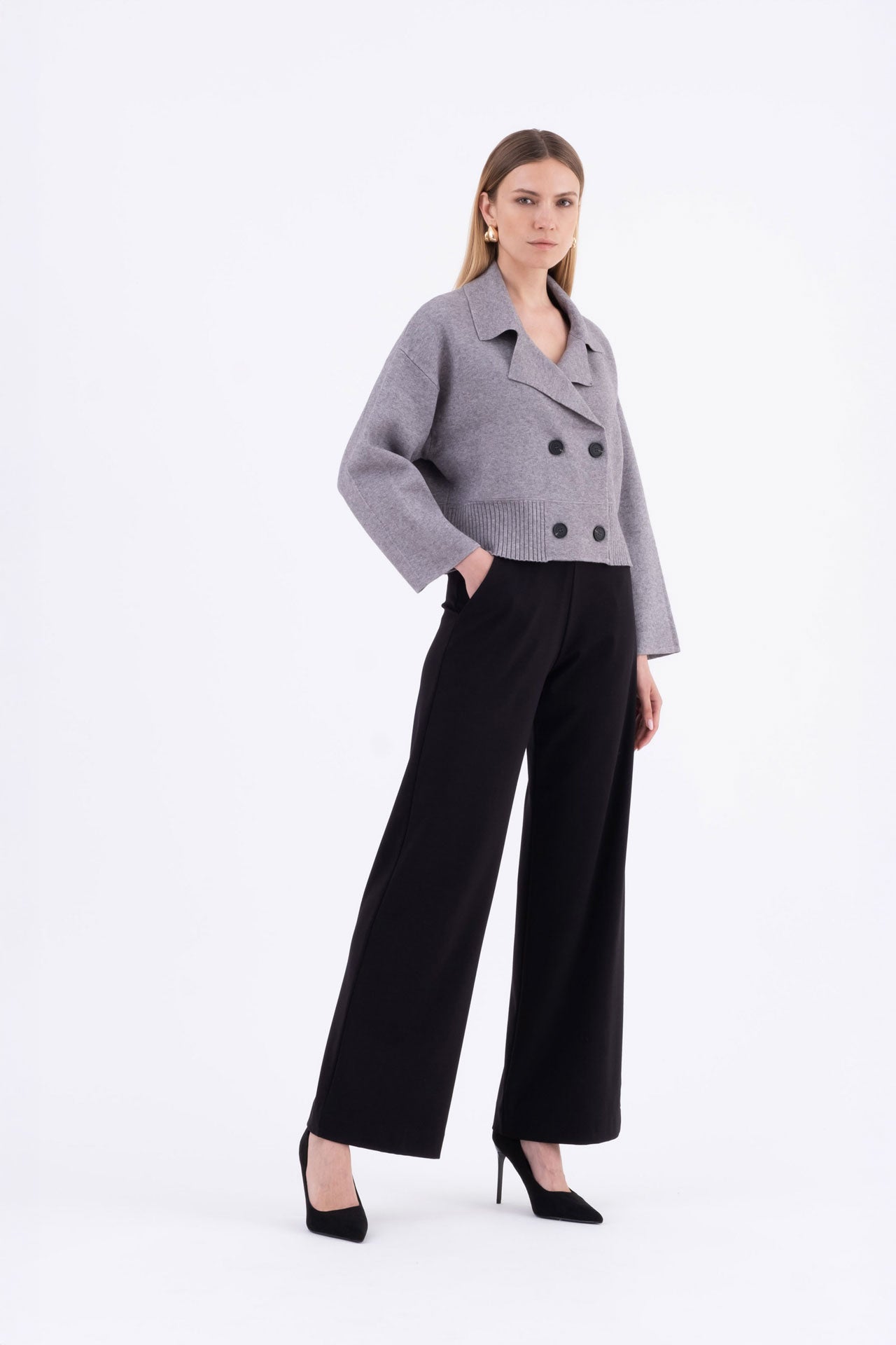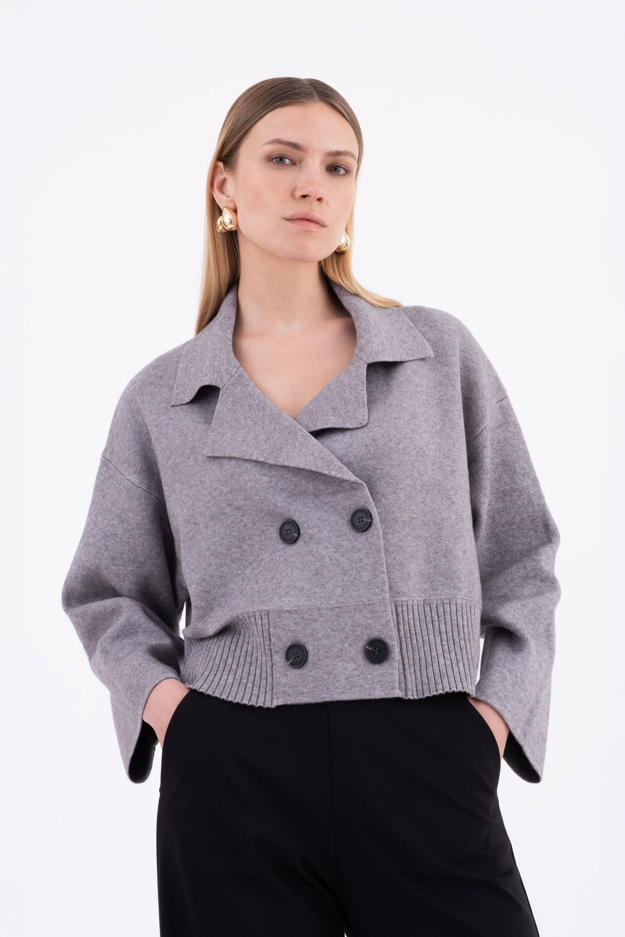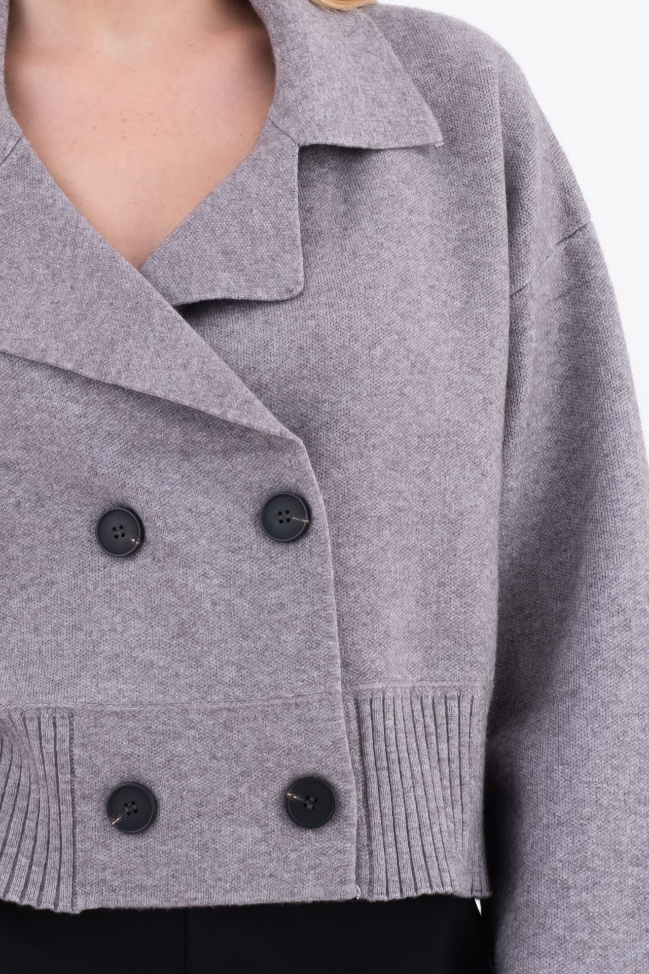 Cropped knit jacket with a boxy cut and double-breasted front. Featuring dropped shoulders and a structured look, it pairs perfectly with high-waisted trousers or pencil skirts.
