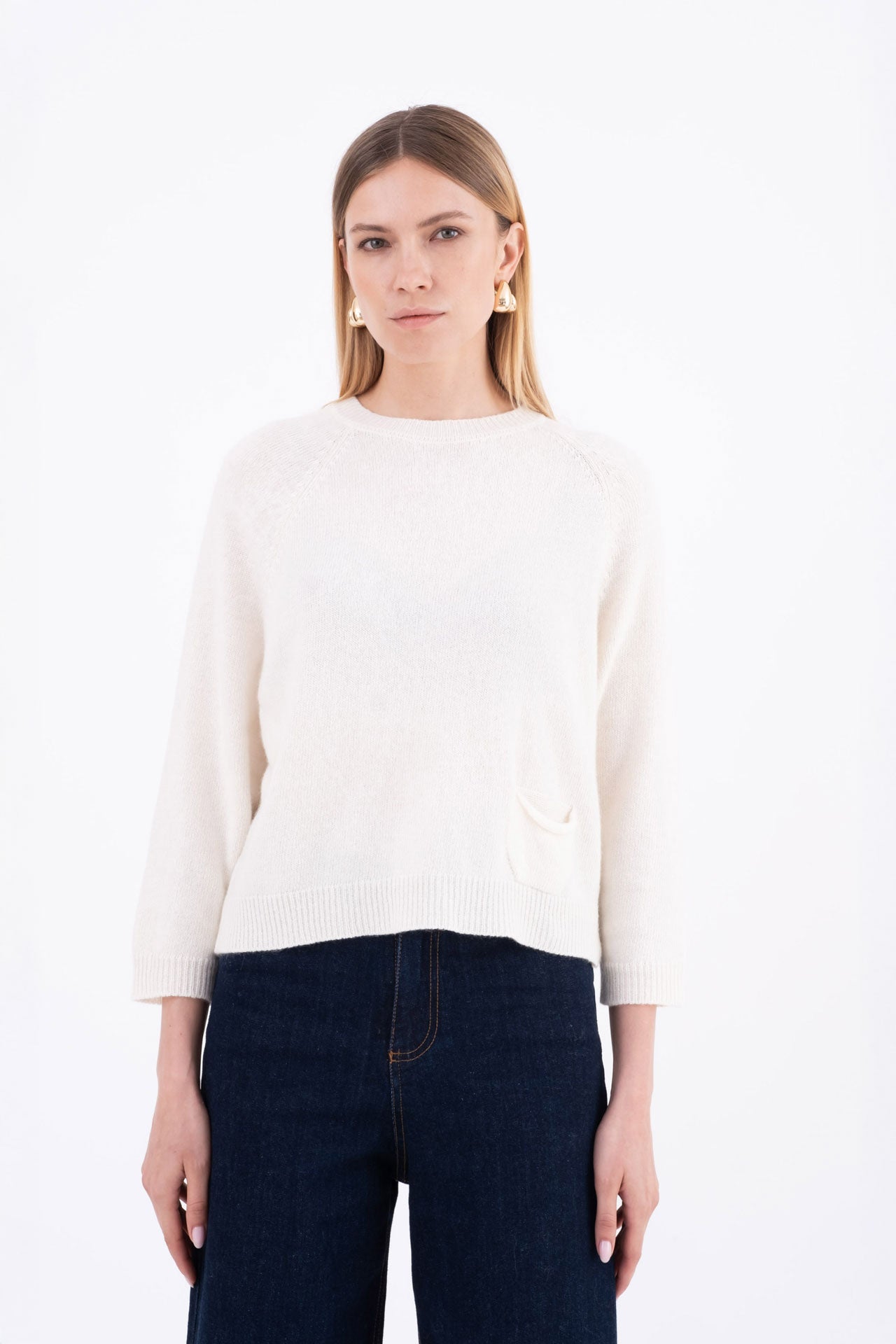 Cropped crew-neck sweater in wool and cashmere, featuring a front patch pocket and three-quarter sleeves.