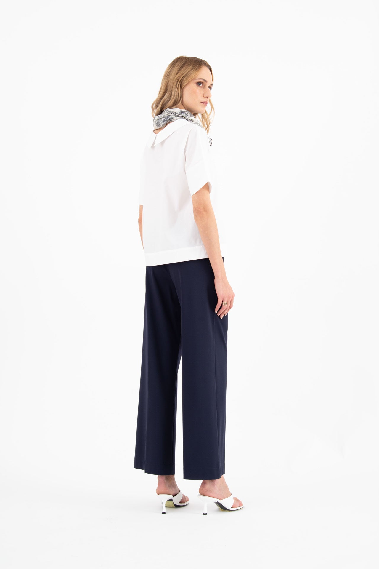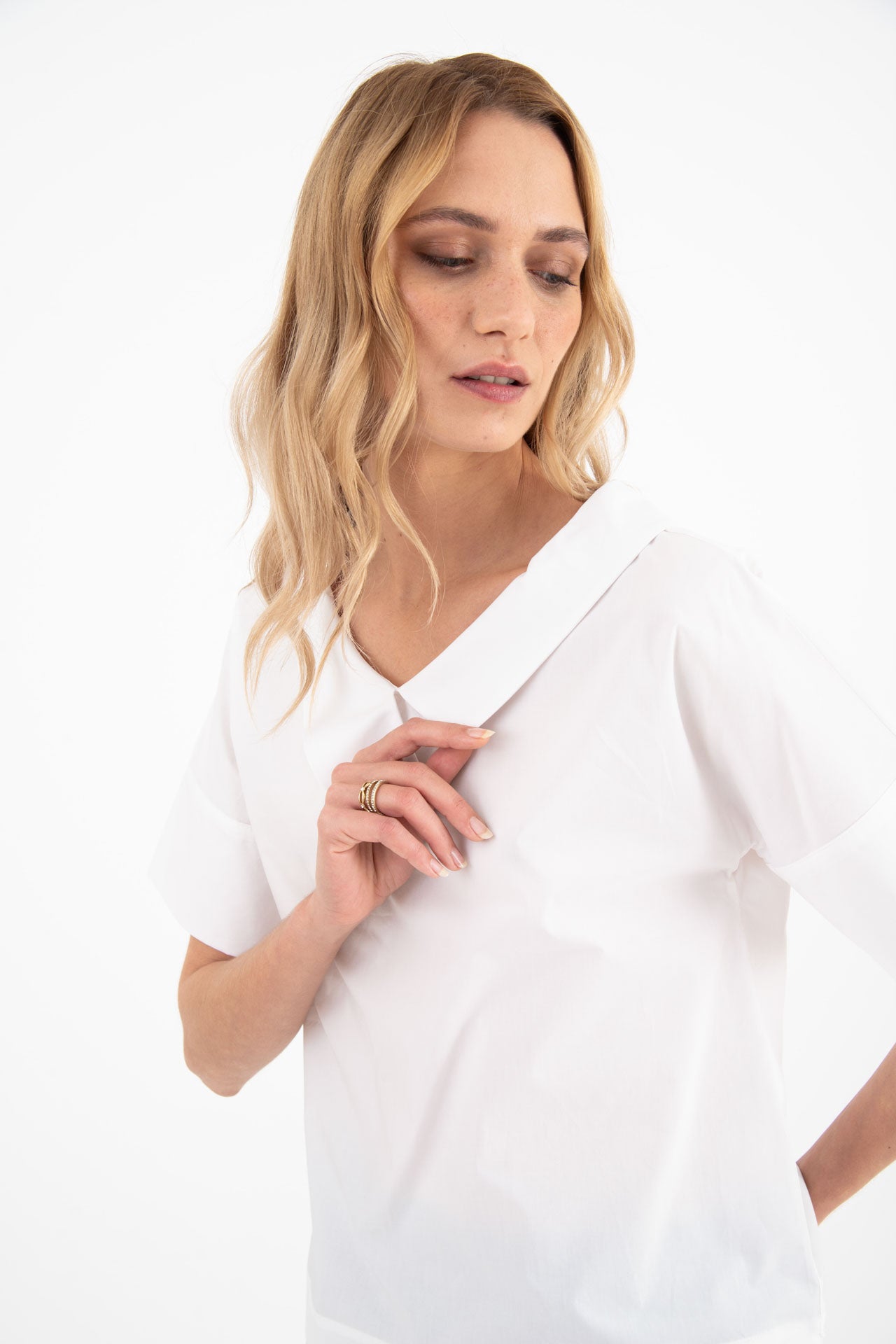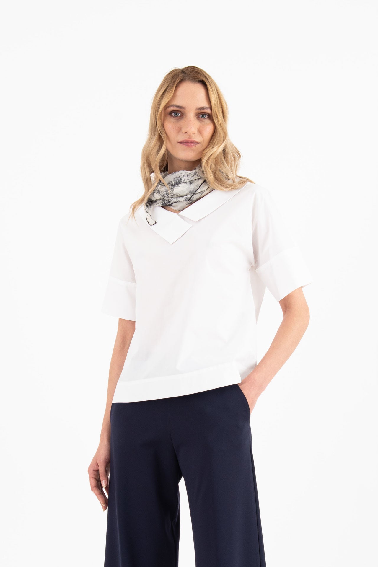 Wide V-neck blouse in cotton poplin. The shirt is detailed with a boxed body, dropped shoulders, and sleeves to the elbow with remittance.