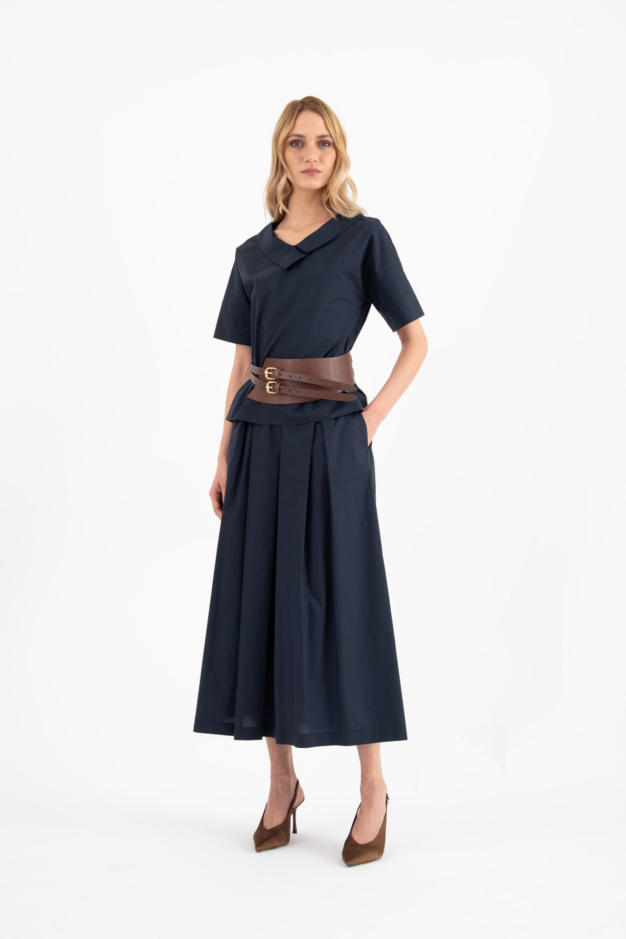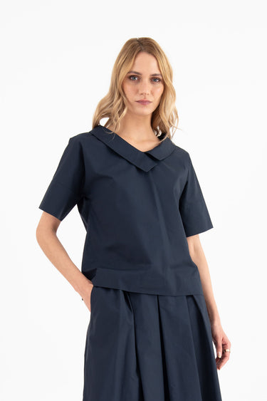 Wide V-neck blouse in cotton poplin. The shirt is detailed with a boxed body, dropped shoulders, and sleeves to the elbow with remittance.