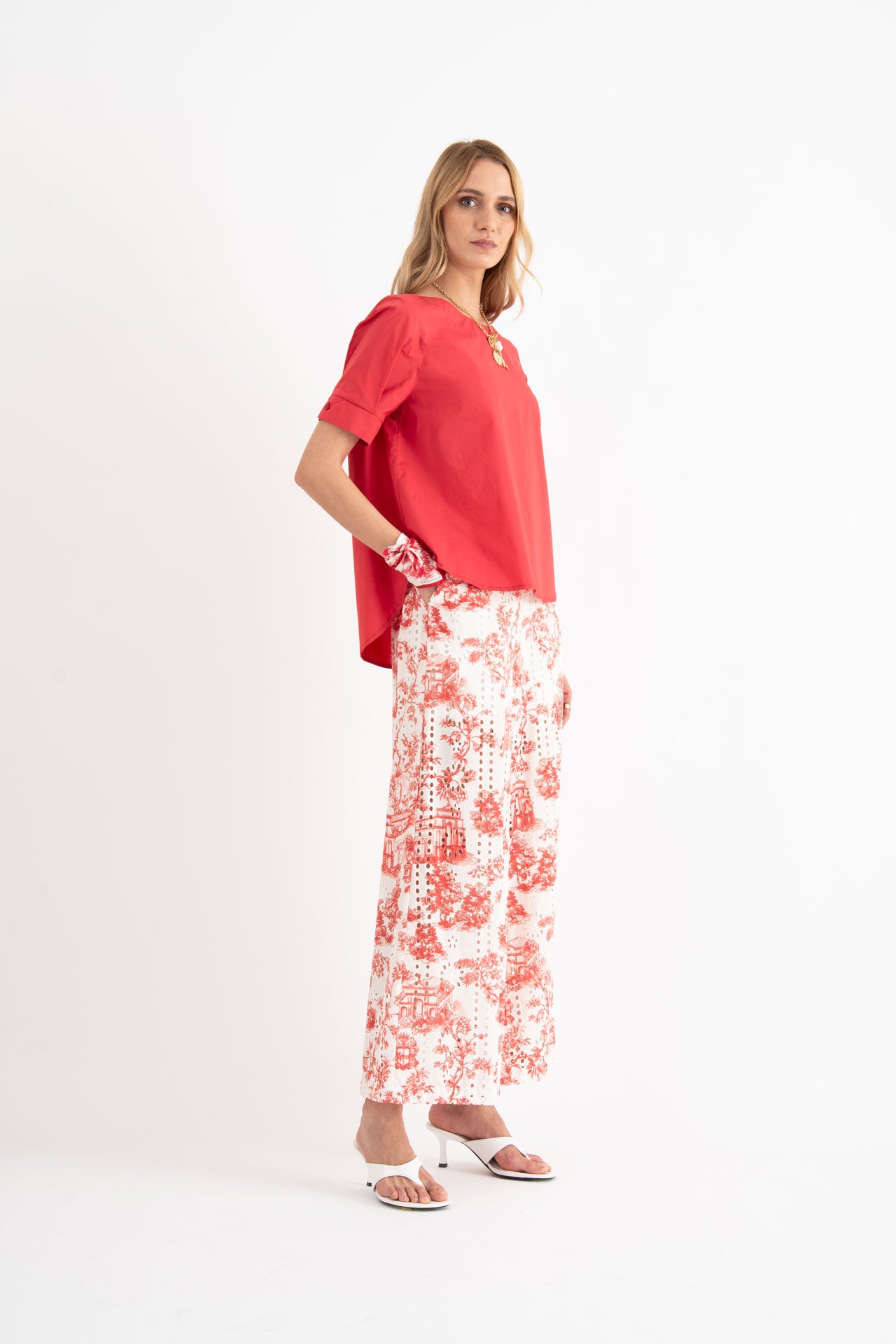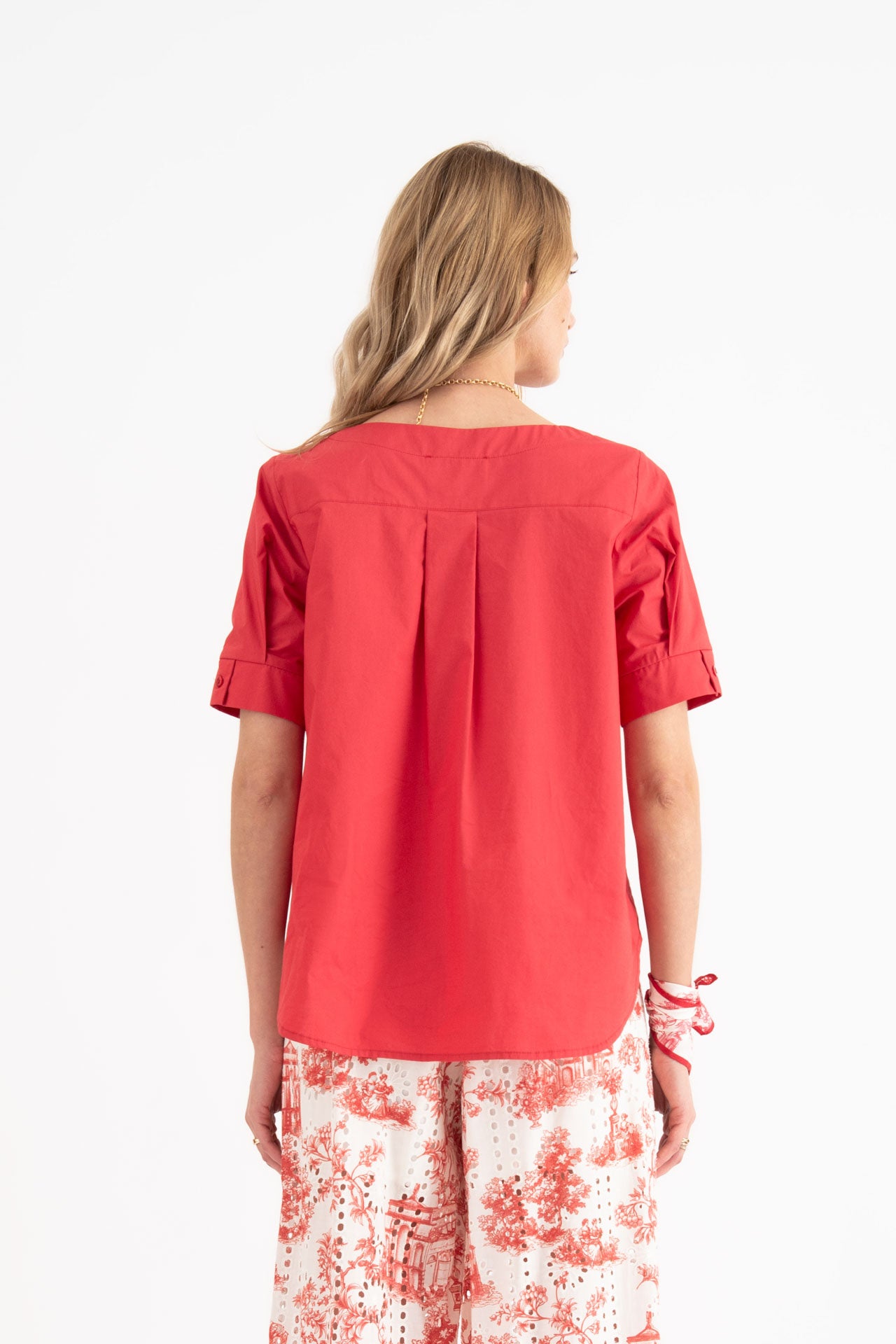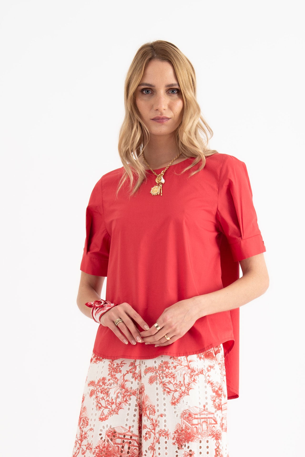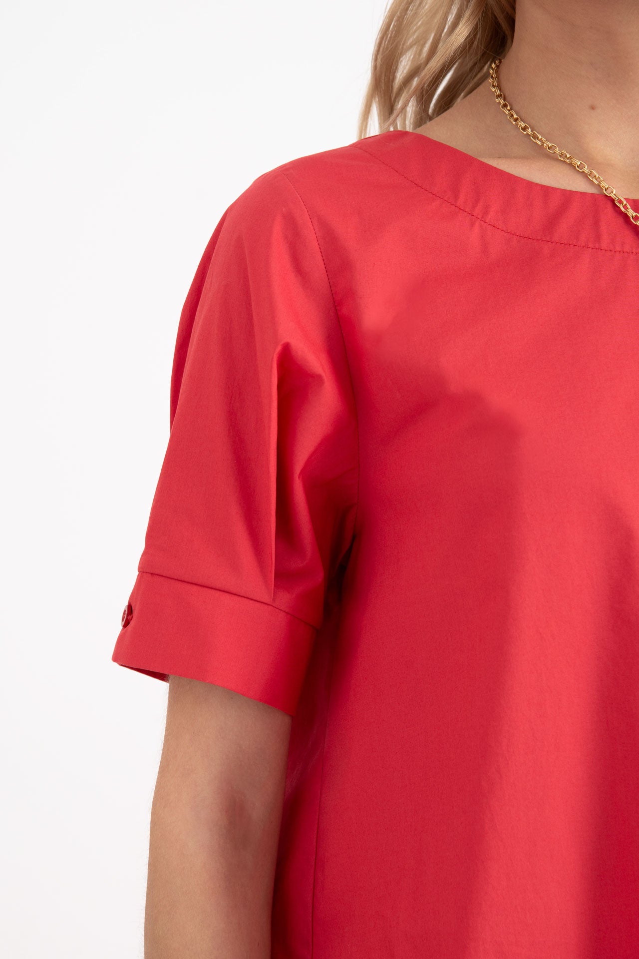 Top crafted from cotton poplin, featuring a clean, essential silhouette and a crisp hand feel. The design is defined by a wide neckline and short sleeves with lateral buttoned openings, allowing the sleeves to be worn closed or subtly opened for a customizable look.