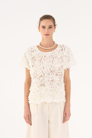 Tulle blouse with laser-cut floral appliqués, short kimono sleeves, and a round neckline.