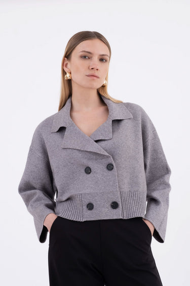 Cropped knit jacket with a boxy cut and double-breasted front. Featuring dropped shoulders and a structured look, it pairs perfectly with high-waisted trousers or pencil skirts.