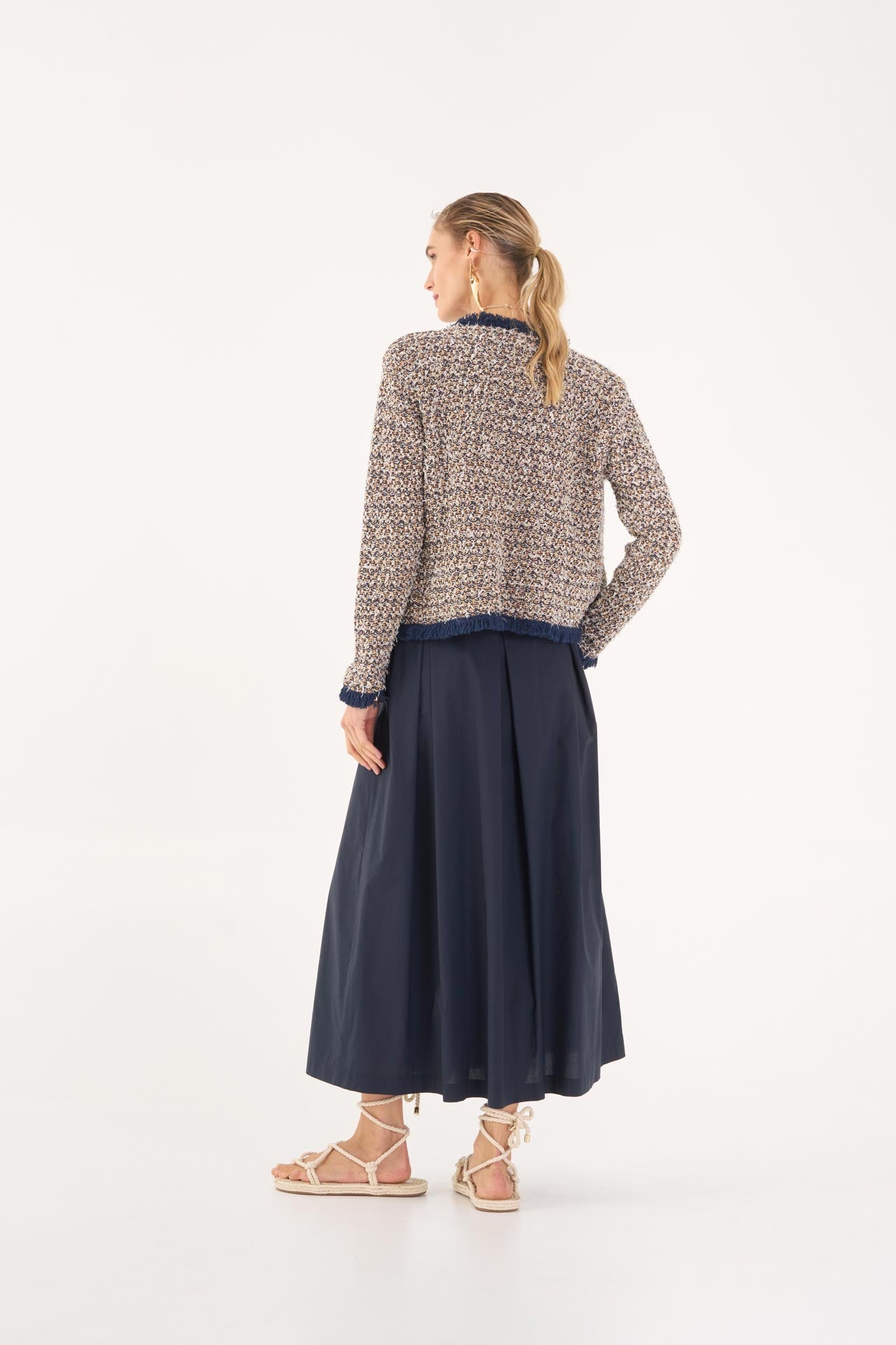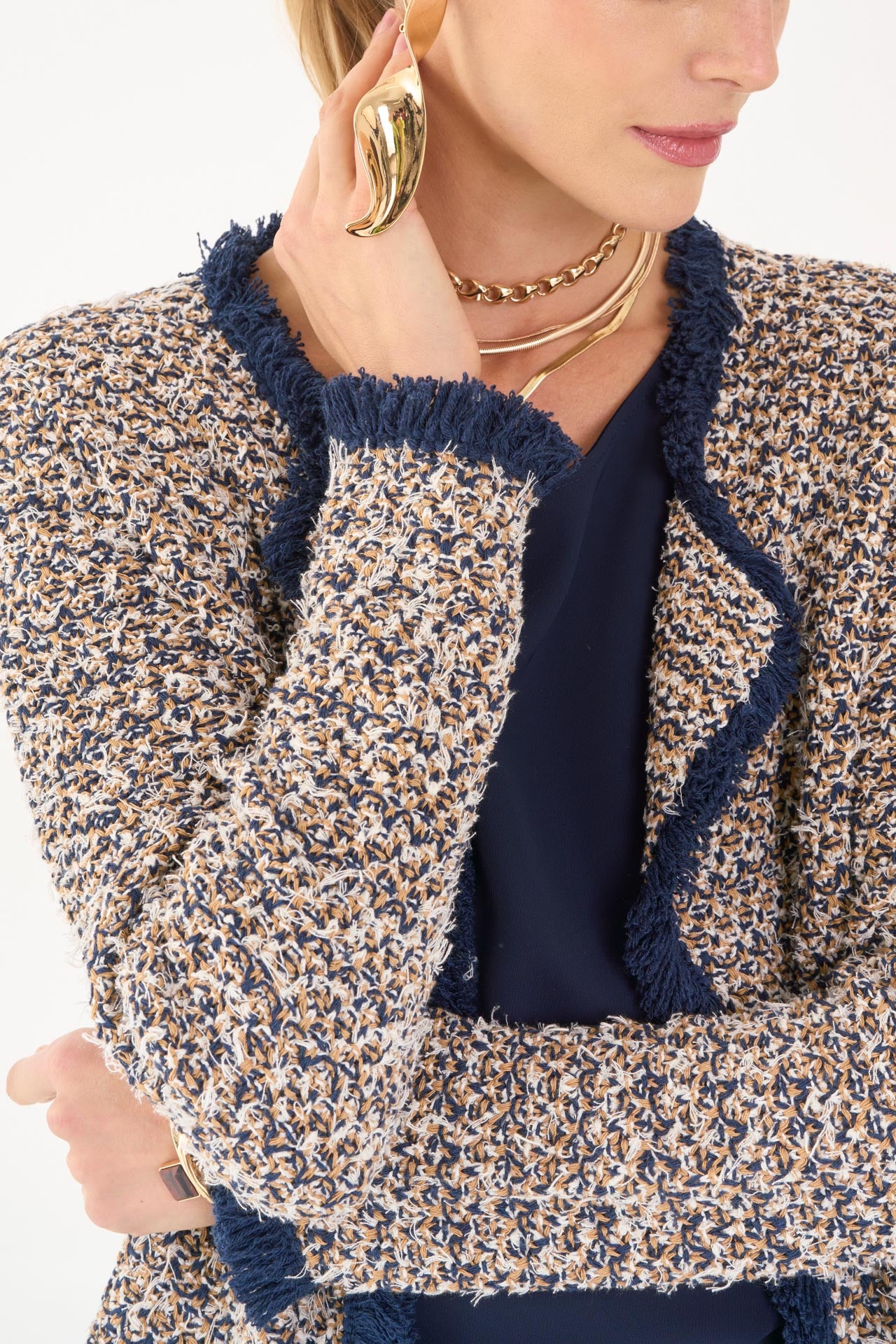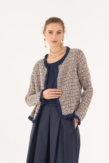 Giacchino chanel filato di cotone beige blu con finitura frange Massima