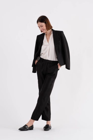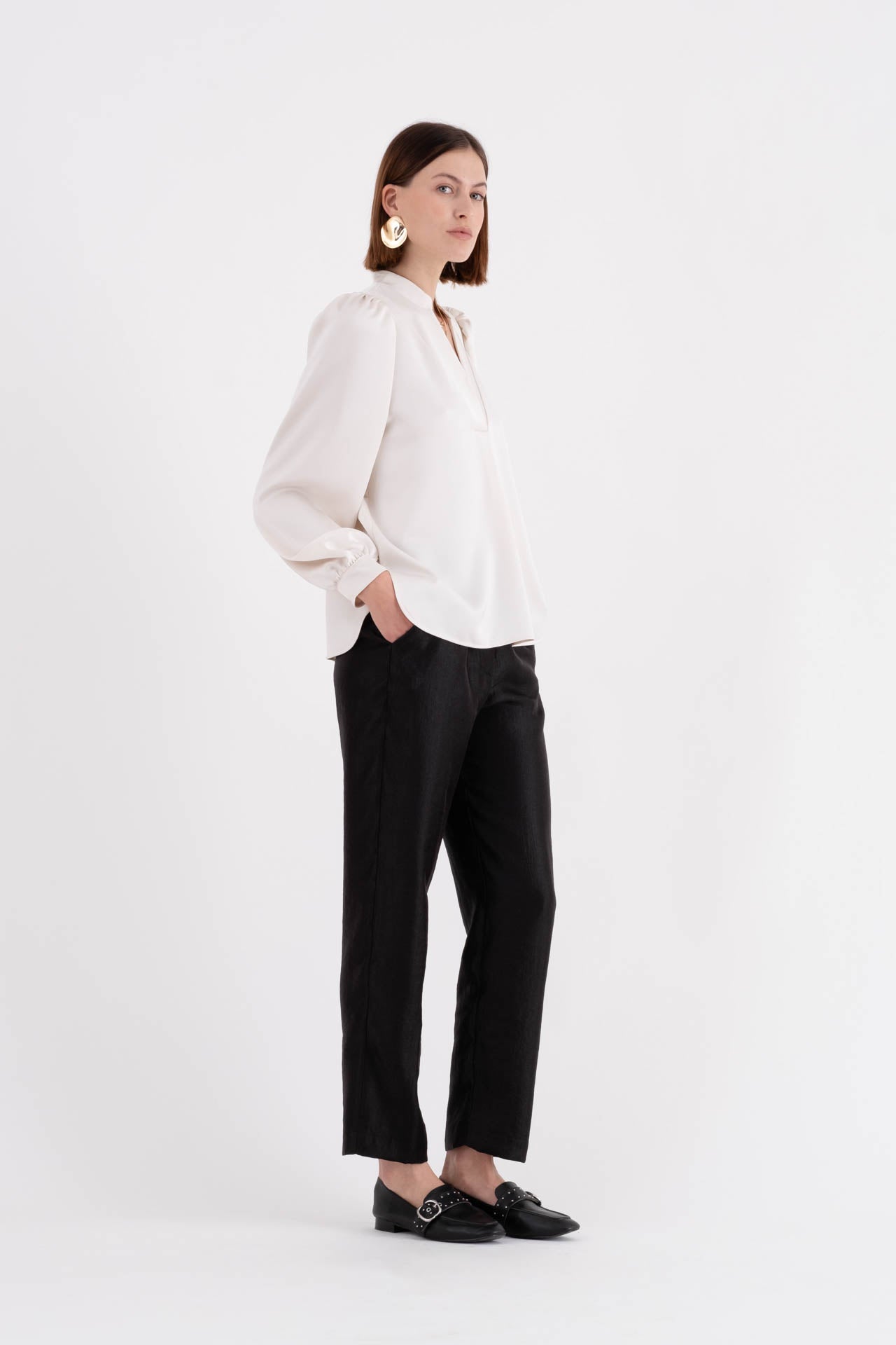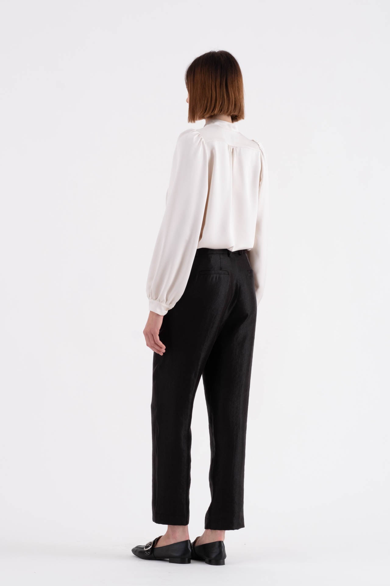 Il pantalone Paderna è realizzato in pregiato tessuto mirror, che dona luminosità e struttura al capo. Il suo taglio regular e la vita alta valorizzano la silhouette, garantendo una vestibilità comoda e raffinata.