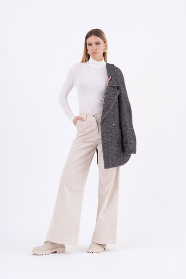 Realizzati in un velluto stretch morbido e caldo, questi pantaloni sono pensati per un’eleganza quotidiana che non rinuncia al comfort.
